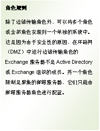 客户典型地自定义他们的Exchange Server 2003的安装过程,用一种非常手动的方式创建特定的服务器角色。在Exchange Server 2007中,角色是预定义的并可以在安装过程中进行选择。安装过程中选择的角色确保了只安装必需的服务和组件。这一方法不仅简化了部署过程,随着时间的推移,对Exchange的管理和对硬件的利用更加高效与简捷、尤其是,增强系统的可伸缩性的维护,Exchange服务器角色如下: