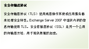 Kerberos认证服务用来进行认证,简化的安全传输层协议用来进行加密。TLS在Exchange Server 2007中进行了简化,因为它使用自身指定的SSL认证。因为每一台Exchange服务器都使用一个SSL认证自动进行配置,内部的Exchange服务器不能仅用SSL对信息进行加密,但是如果外部SMTP服务器设置为使用TLS收发信息,那么这些信息也会被加密。