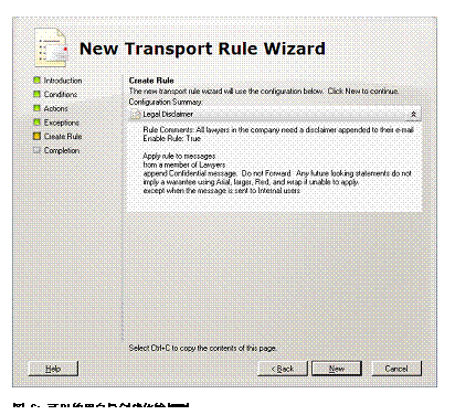 Exchange管理员可以在Exchange Server 2007中定义满足企业制度要求的邮件传输规则。满足相应传输规则的邮件在传输的过程中会受传输规则影响,系统会对该邮件采取相应操作。规则可以根据邮件发件人,收件人或元数据(比如邮件中的一个词或短语)或邮件分类来制定。诸如机密邮件或私人邮件等邮件分类可以由用户设定或者由设置如。