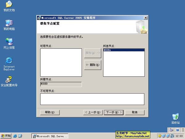 之所以会对SQL2005感兴趣,主要是因为很多朋友都在用,而且未来我可能也会接触它。一直以来都想搞一次MDaemon的冗余方案测试,本来打算采用免费的MySQL可是发现目前的4.x版本竟然无法正常运行在MSCS上,无奈等待了有数月之久直到微软的SQL2005发布,哈哈!机器的内存也升级到1.5G,所以决定抱着勇于求知的精神开始筹备测试部署SQL2005群集,年前最后一天班下午没有太多事情就搭建了一个DC+NodeA+NodeB的群集环境,安装SQL2005还是比较顺利的,后来放入第二张盘安装便失败了,以为是因宿主性能造成(在512M内存的虚拟机中安装SQL2005群集,真的是非常得慢,我可怜的硬盘),决定年后上班搭建一个双节点群集环境来做测试,这样一来资源占用应该会小很多,毕竟撤掉一台单独的DC。