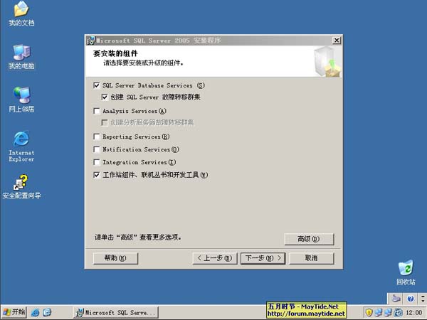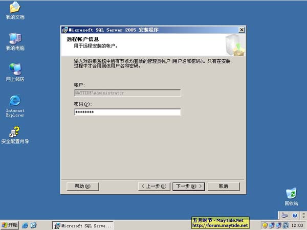 17、为服务配置帐户,之前我已经添加了一个名为sql2005的域用户作为SQL服务帐户,所以这里填写上正确的信息。