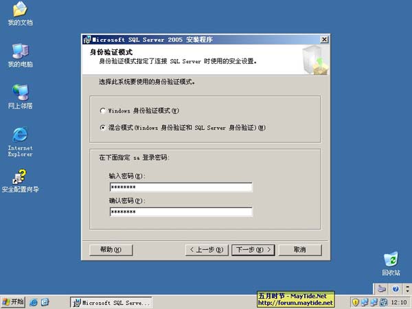 19、身份验证模式中,选择“混合模式”这和SQL2000的感念是一样的。