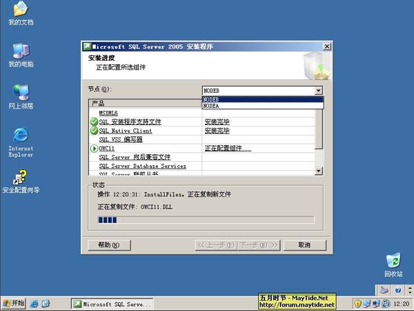 23、SQL2005的群集安装进度还是很人性化的,这里你可以切换每个节点来监视安装进度。