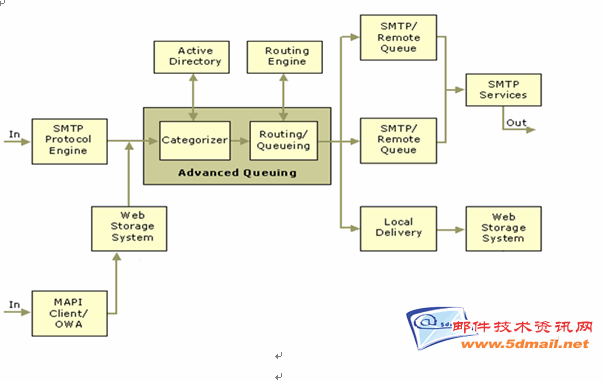 1. 高级队列引擎(Advanced Queuing Engine,下文简称AQE)。作为传输模块的心脏,高级队列引擎控制着SMTP服务器上邮件的处理流程,所有提交到SMTP服务器的邮件,都无一例外的要经过AQE的处理。