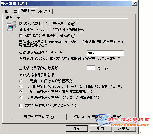 1. 完美整合Windows Active Directory。只需简单点击鼠标启用此功能,MDaemon即可随时跟踪同步Active Directory中账户的增删和改动,并且支持多种的账户删除模式,更加便于公司管理流动人员。MDaemon9.0是现今除了Exchange 之外,唯一可以与Windows的Active Directory结合使用的邮件系统。(见下图)