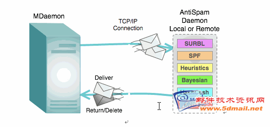 2. 在MDaemon9.0中,IMAP服务、内容过滤器、垃圾邮件过滤器、病毒过滤器等在设计上的重大革新和高性能、多线程设计带来了处理速度上的突飞猛进。另外,AntiSpam功能组件从MDaemon9.0开始可以在网络后台单独处理邮件收发,并可以和主程序分离,在另外的服务器上单独运行。(如下图)