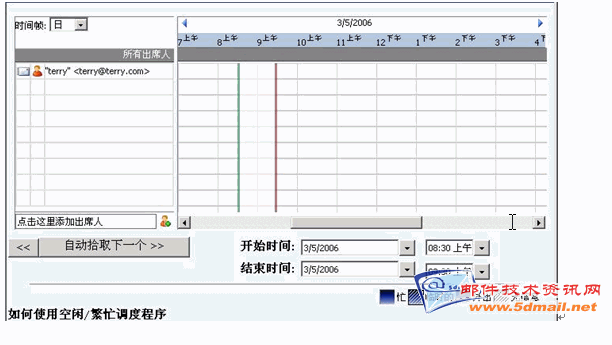 6. MDaemon9.0中的“Free/Busy”服务允许MDaemon和OUTLOOK用户查询“Free/Busy”信息,因此用户在安排会议或计划事件的时候可以看到彼此的安排。(见下图)