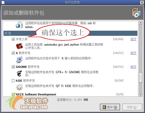 第三步,由于NVIDA的Linux版驱动程序是编译安装的,所以要求Linux中安装GCC编译器和正在使用的内核的源代码文件。如果在安装FC3时选择了安装“开发工具”,那么就已经包含了;如果没有则可以通过FC3中的添加/删除进行安装。如图-2。