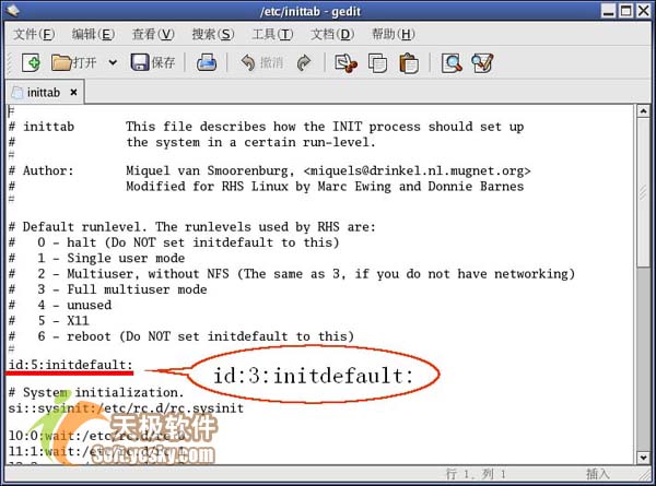 第四步,确保在字符终端中登陆,因为NVIDIA的显卡驱动程序安装时X服务器不能运行。如果默认是启动图形界面登陆,登陆FC3,用文本编辑器(比如:gedit或者vi)打开/etc/inittab这个文件,找到“id:5:initdefault:”,将其中的5(就是两个冒号中间的那个)改为3(将3改回5即可默认从图形界面登陆),保存,重新启动计算机,在进入登陆界面就是字符终端了。如图-3。