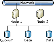 下图展示了双节点群集中仲裁磁盘资源的情况。每个群集都有一个仲裁磁盘资源,而且在一个时间仅有一个节点能够访问该资源。该节点(即该时刻的仲裁磁盘资源所有者)将负责更新仲裁驱动器上的仲裁日志。