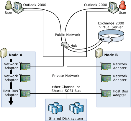下图展示了虚拟服务器的概念以及它与实际的群集节点的关系。用户将打开他们的 Outlook 客户端并通过网络连接到当前被节点 A 拥有的 Exchange 虚拟服务器。节点 A 是控制包含 Exchange 2000 Server 数据库的共享磁盘的节点。