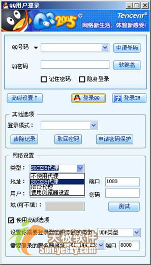了解了上面的知识,我们再来看腾讯QQ登录时的网络设置就不会感到陌生了。如图10所示。这里有SOCKS5代理、HTTP代理、使用浏览器设置等多种类型供用户选择,找到合适的服务器地址和用户密码后,用户就可以快速方便的连接到服务器了。同时,还要考虑需要登录服务器的类型以达到更好的效果。