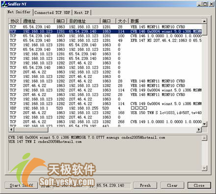 一般来说,用户微机上的程序统称为MSN Messenger“客户端”,它通过Internet连接到一个MSN Messenger“服务器”。也就是说,客户端通过服务器与其他客户端交互信息。在大多数时间里,用户的客户端与服务器会话,然后由服务器来处理这些会话信息并通知其他人。了解之前,我们使用Sniffer NT来截获登录时的数据。如图1所示。