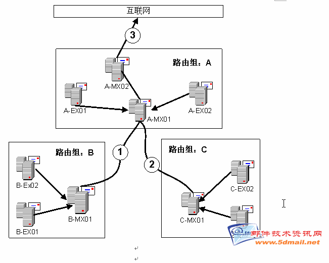 路由组通常由一些具有高速连接或者地理位置分布上靠近的服务器所组成。在路由组内部,服务器之间的邮件传递是通过直接连接进行的。例如,当图一C路由组中C-EX02服务器上的邮箱用户发信给C-EX01服务器上的邮箱时,C-EX02的SMTP引擎和C-EX01建立直接的连接并进行邮件投递。