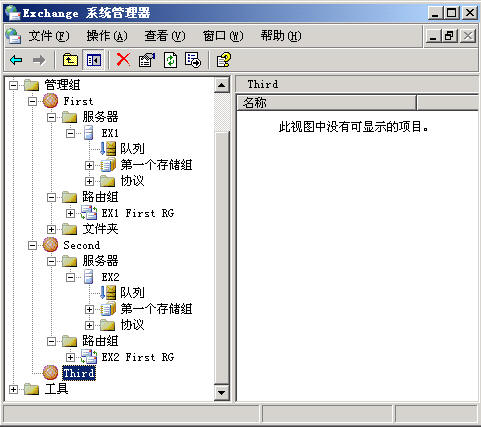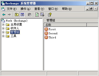 从上图可以看出,“Third”这个管理组也建好了。在这里我还有一个地方要很慎重的提醒大家,当一台Exchange服务器已经属于一个管理组的时候,它不能移动到别的管理组,举个例子:比如一台Exchange服务器已经属于上述的“First”管理组了,如果你希望这台服务器属于“Third”管理组的时候,你唯一的办法就是把这台服务器删除,然后重新安装Exchange,在安装过程中会让你选择这台服务器属于哪个管理组,一旦加入后,将不能进行更改,所以这一点请大家要注意顺序,一定要先建管理组,然后再安装Exchange,反过来是不行的。那我们现在分别展开一下几个管理组,看看里面的内容: