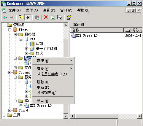从以上截图中,可以看到以下信息:“First”这个管理组下有一台名为“EX1”的Exchange服务器,里面只有一个路由组,名字是“EX1 First RG”,“Second”管理组里有一台名为“EX2”的Exchange服务器,里面也只有一个路由组,名字是:“EX2 First RG”,“Third”这个管理组由于是新建的,所以里面什么都没有。那我们现在就准备到“First”管理组里的路由组容器下去新建一个名为“EX1 Second RG”的路由组。我们选中“First”管理组下的路由组容器,然后击右键: