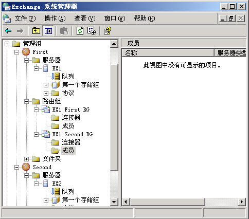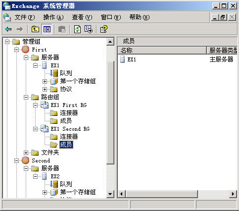 从上图可以看出,路由组“EX1 First RG”的“成员”里有一台名为“EX1”的主服务器,而“EX1 Second RG”由于是新建的,所以里面没有成员:
