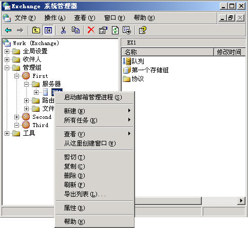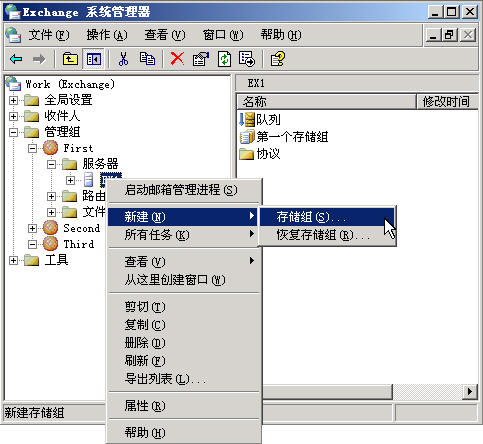接下去,我们再到“First”管理组下面的“EX1”服务器下建立另外一个存储组,依次展开“First-服务器”,在“EX1”上击“右键”: