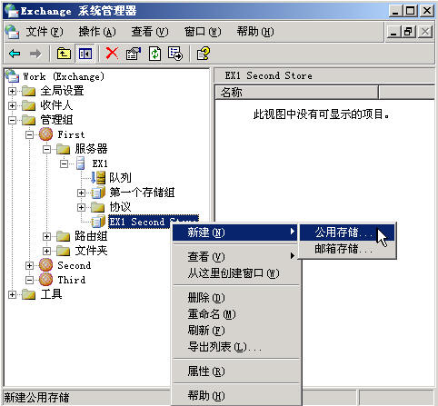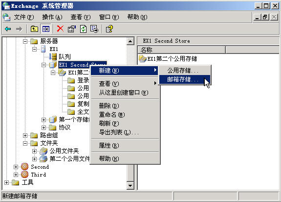 建立完成后,再依次展开“First-服务器-EX1”,在我们刚刚建立的“EX1 Second Store”上击右键,选“新建”: