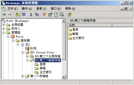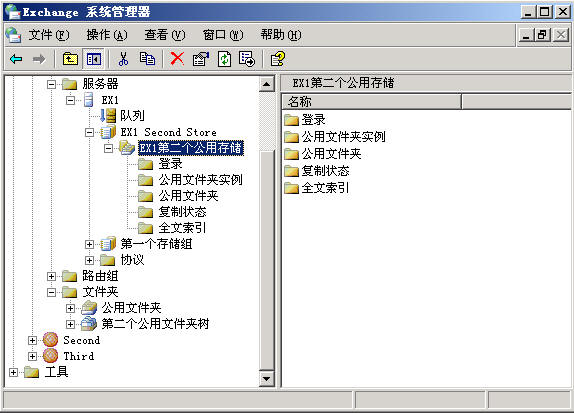 大家可以看到“EX1 Second Store”已经创建成功了,只是里面没有什么东西,那我们现在就在里面创建一个“公用存储”和“邮箱存储”,要创建“公用存储”就必须先创建一个“公用文件夹树”,展开“First”,在“文件夹”上击右键: