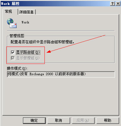 请大家注意我用红框标注的位置,在默认情况下,“显示路由组”和“显示管理组”前的勾是不会被打上的,所以这个地方需要我们手动去把勾打上,然后再“确定”退出,然后再重新启动“Exchange系统管理器”就可以出现我的第一张图所示的管理介面了,还要提醒大家一点,可能细心的朋友已经发现了,上图中的“显示管理组”是呈灰色不可选的,当你的Exchange组织里存在着两个或两个以上的管理组的时候,系统不允许你不显示管理组,也就是说你必须显示管理组,而且这样的话,两种界面的切换就不可逆了。你只能用我上面的第一张图的管理介面来管理你的Exchange服务器了。OK,那我们就在这样的管理介面上来进行服务器的管理工作了,主要是我们来进行以下几个操作: