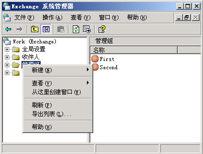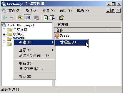首先来新建一个管理组,我们在Exchange系统管理器上,选中管理组,然后击右键: