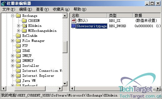 首先,其实在Exchange系统管理器的一些容器的属性里,还有一个 “安全”标签,只是在默认情况下并不被显示出来而已,这个我们可以通过修改注册表来把它显示出来,点击“开始-运行”,输入:“regedit”,然后回车,依次展开“HKEY_CURRENT_USER—Software—Microsoft—Exchange—EXAdmin”,在里面新建一个DWORD值,名称是Showsecuritypage,值为1,如下图所示: