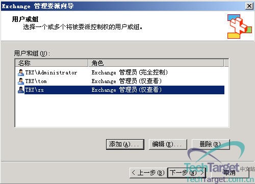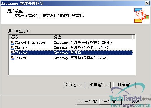 大家可以看到,我刚刚添加的“tom”和“zs”已经被添加进来了。具体的权限也可以看清楚了,其实刚刚执行的委派操作在这里也可以进行的,只是如果你对Exchange不是很熟悉的话,你在这里添加用户你会发现里面的很多权限你都不知道是干什么用的。所以一般情况下我还是建议大家用刚刚的向导来做。