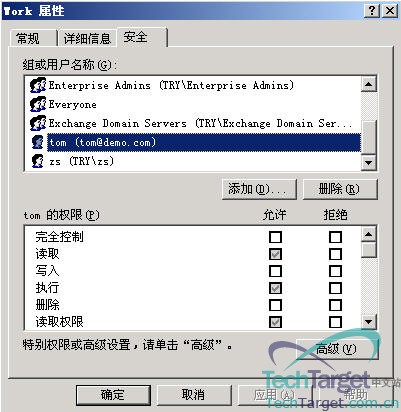 大家可以看到现在的权限已经是呈可改状态了,这时如果你要希望“tom”对“first”管理组有管理权限的话,你只要在相应的权限上打上勾就可以了,如果你不希望“zs”用户对“First”查看权限,那么在这里也可直接进行删除,修改完毕后点击“确定”退出。