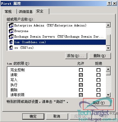 我们可以看到“tom”和“zs”这两个用户也有只读权限,并且呈灰色不可改状态,表示这个权限是继承而来。我们点击一下我用红框标出的“高级”按钮: