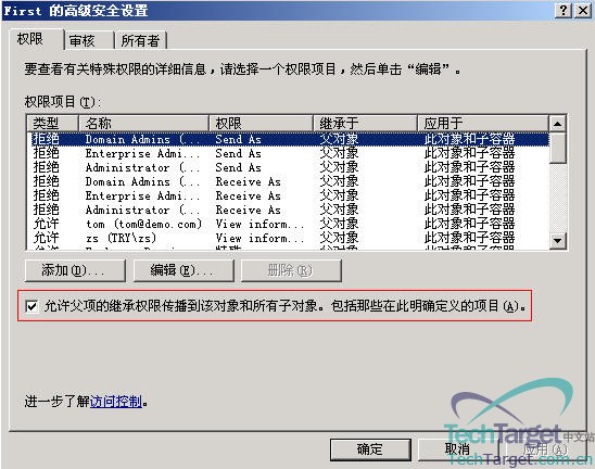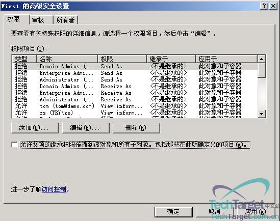 这里我们可以看到一些继承权限,这里的操作和上面的一样,也是点“添加”,只是在选择角色的时候要选“Exchange管理员”,至于是不是选完全控制,大家视实际情况而定了: