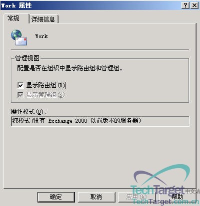 修改完成后退出,然后打开Exchange系统管理器,在组织上单击右键,选“属性”,我们来看一下修改前后有什么区别,先来看一下修改前的: