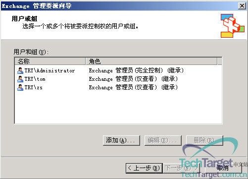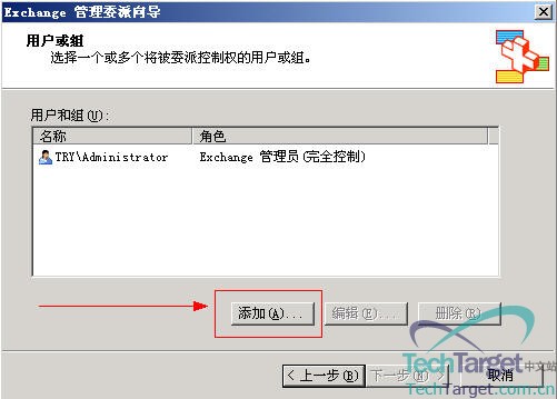 大家可以看到,在默认情况下域的Administrator已经是Exchange管理员了,而且是完全控制的,点击上面的“添加”按钮: