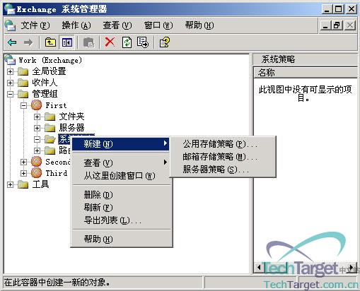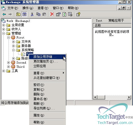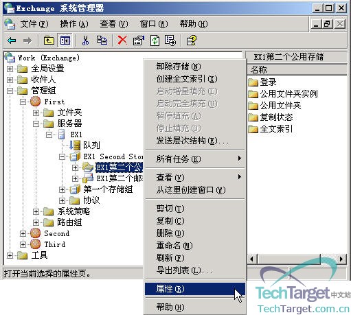 现在我们来验证一下这条策略有没有起作用,依次展开“组织—管理组—First—服务器—EX1—EX1 Second Store”,然后在“EX1第二个公用存储”上击右键: