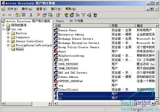 现在我们从实际问题回到虚拟环境来,我在上一篇文章的虚拟环境中有两台Exchange服务器,分别是EX1和EX2,EX1属于First管理组,而EX2属于Second管理组,在活动目录里分别存在一个名为“tom”和一个名为“zs”的二个用户: