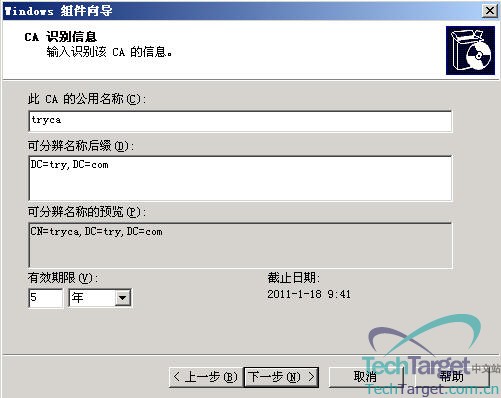在“此CA的公用名称”上输入一个方便记忆的名称,我这里输入的是“tryca”,其它保持不变,然后点“下一步”: