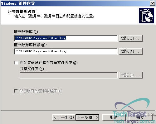 在这里可以设定“证书数据库”和“证书数据库日志”的物理存储位置,设置完成后点“下一步”: