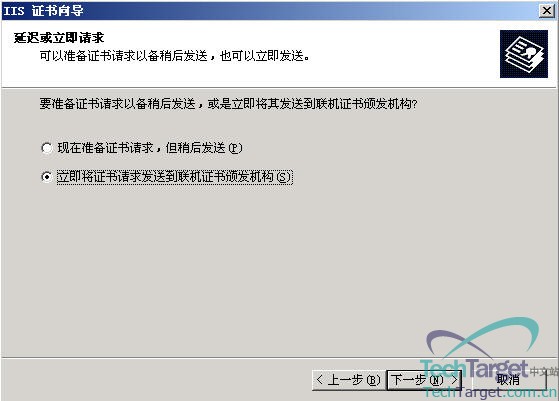 选中“立即将证书请求发送到联机证书颁发机构”,然后点“下一步”: