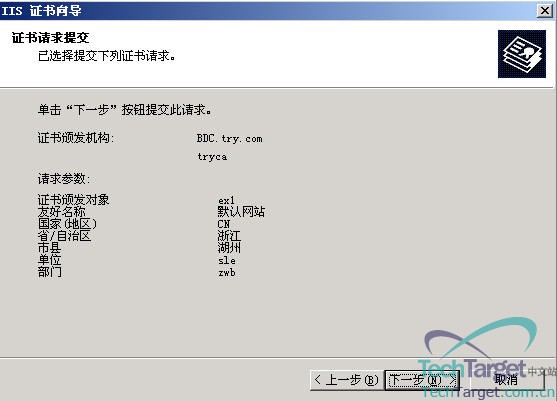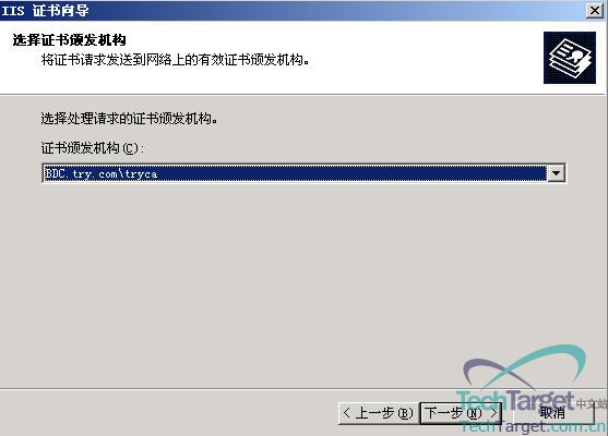 证书颁发机构我们要选择刚刚在BDC上建立的“tryca”,如果你的网络上有多个证书服务器的话,这里可以选择: