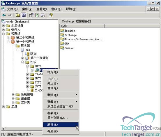 依次展开“组织—管理组—第一个管理组—服务器—EX1—协议—HTTP”,并定位到“Exchange”,并且击“右键”: