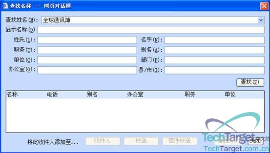 我们发现,通过OWA也可以和Exchange服务器的全球通讯簿联系,我们可以输入收件人的一些属性,如显示名称、姓、名等来搜索收件人,当然没有像Outlook 2003那样全部罗列出来挑选这么容易。操作上要略徽的麻烦一些。