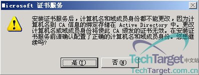 上面那个警告窗口的意思是一旦安装证书服务后,该计算机名和成员身份将不能进行更改,否则会破坏原颁发的证书,这一点大家一定要注意的,当然在这里你也别无选择,你只能选“是”,除非是你不想安装证书服务: