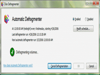 在Windows Vista里,微软公司最终添加了自动磁盘整理的功能。实际上,磁盘碎片整理程序可以被设置为每天清理硬盘一次 。当第一次安装了5308版的Windows Vista,并不知道这个功能,听到来自硬盘的噪音,就像以前习惯在Windows 3.X的时代 听到的那种操作系统试图努力将SWAP文件排成直线时、以及最初在Beta软件中注销时所发出的一样。 当注意到他以规则的时 段持续产生后,打开任务管理器,发现磁盘碎片清理程序在后台运行。没有任何图标或者接口指示告诉你这个程序正在运行 。但当我在开始菜单找到了它的图标,并运行它之后。透过图形界面,却发现磁盘碎片清理程序的确已经在运行了。日程安 排出现在窗口中,如果点击“调整安排”的按钮,便可以根据自己的喜好来重新编排运行日程。