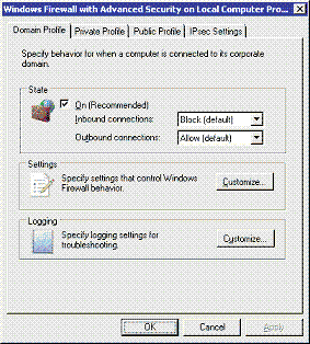 因为具有多个高级配置选项,并且具有相同的本地和 Active Directory 组策略配置,新的 Windows 防火墙也可以使用一个名为“带有高级安全性的 Windows 防火墙”的 MMC 管理单元来配置。 在 Beta 版本的 Windows Vista 和 Windows Server "Longhorn" 中,您必须将“带有高级安全性的 Windows 防火墙”管理单元添加到 MMC 控制台中。 当前“管理工具”文件夹中没有预定义的用于“带有高级安全性的 Windows 防火墙”管理单元的控制台。