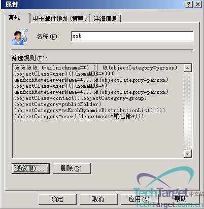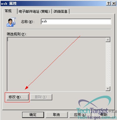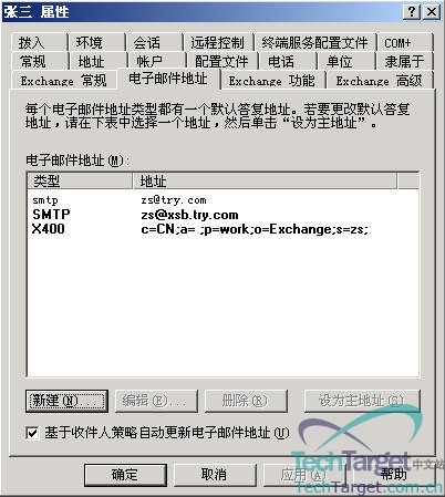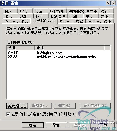 点“是(Y)”。然后用相同的办法去新建后勤部的策略,对应着做出修改,方法同上,然后再去对“张三”和“李四”进行“Exchange任务”我们来双击一下用户名,看一下“属性”中的“电子邮件”选项,来看看有没有达到我们的要求: