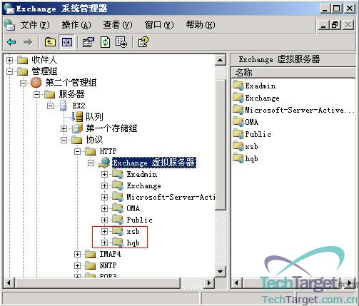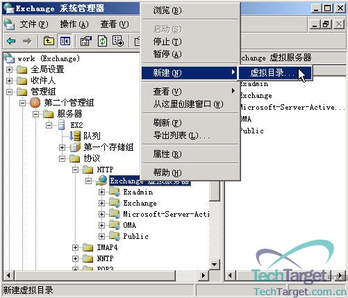 依次定位到“组织—管理组—第二个管理组—服务器—EX2—协议—HTTP—Exchange虚拟服务器”,并在上面击“右键”: