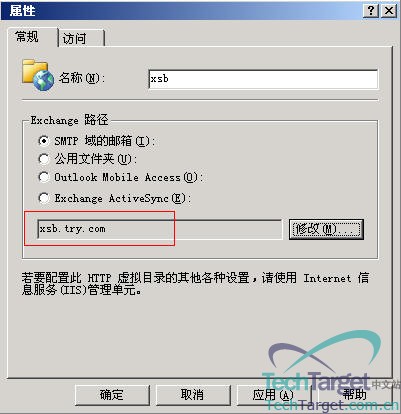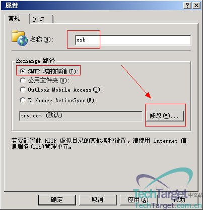 “名称”里我们输入:xsb,“Exchange路径”里选择“SMTP域邮箱”,然后我们再点一下那个“修改”: