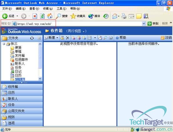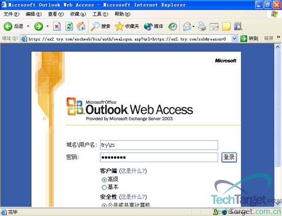 那么前端服务器的配置算是完成了,接下来我们要配置一下后端服务器,其实后端服务器的配置和前端是一模一样的,尤其需要大家注意的是不仅仅方法一样,甚至包括虚拟目录的名字也要求完全一致,配置完成后,重启一下虚拟服务器,然后我们就可以到客户端去验证一下了,转到实验环境的XP上,打开IE,输入:https://ex2.try.com/xsb,请注意,这里不是输入https://ex2.try.com/exchange了,大家不要弄错了: