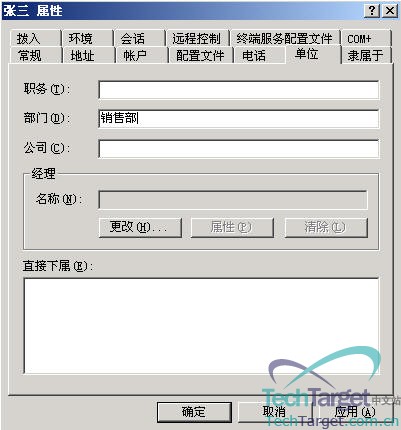 在“部门”里输入:“销售部”,然后点“确定”,对“李四”也进行同样的操作,只是在“部门”里输入的是“后勤部”。此时如果我们对张三和李四进行“Exchange任务”,那么开设的邮箱应该就是zs@try.com和ls@try.com,很明显,这不是我们要的结果,如何让他们的邮箱变成zs@xsb.try.com和ls@hqb.try.com?