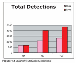 图- 2004 年与 2005 年的这段期间所侦测到的计算机病毒几乎一样都是1300个,相较于 2004 年,2005 年的第二季与第三季所侦测到计算机病毒总数都增加了一倍。去年第三季的数量为 2675 个,而今年的数量为 4716 个,逼近 5000 大关